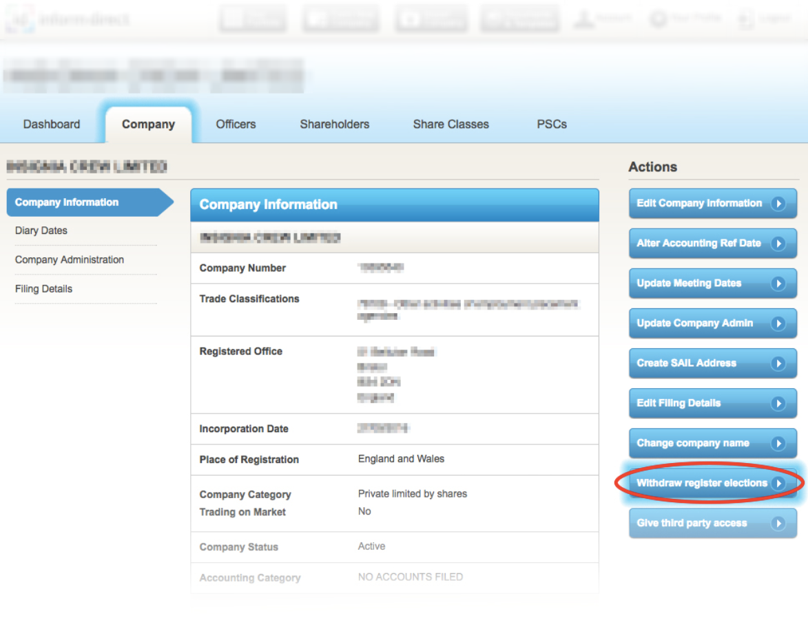 1. Go to the 'Company' tab and select 'Withdraw register elections.'