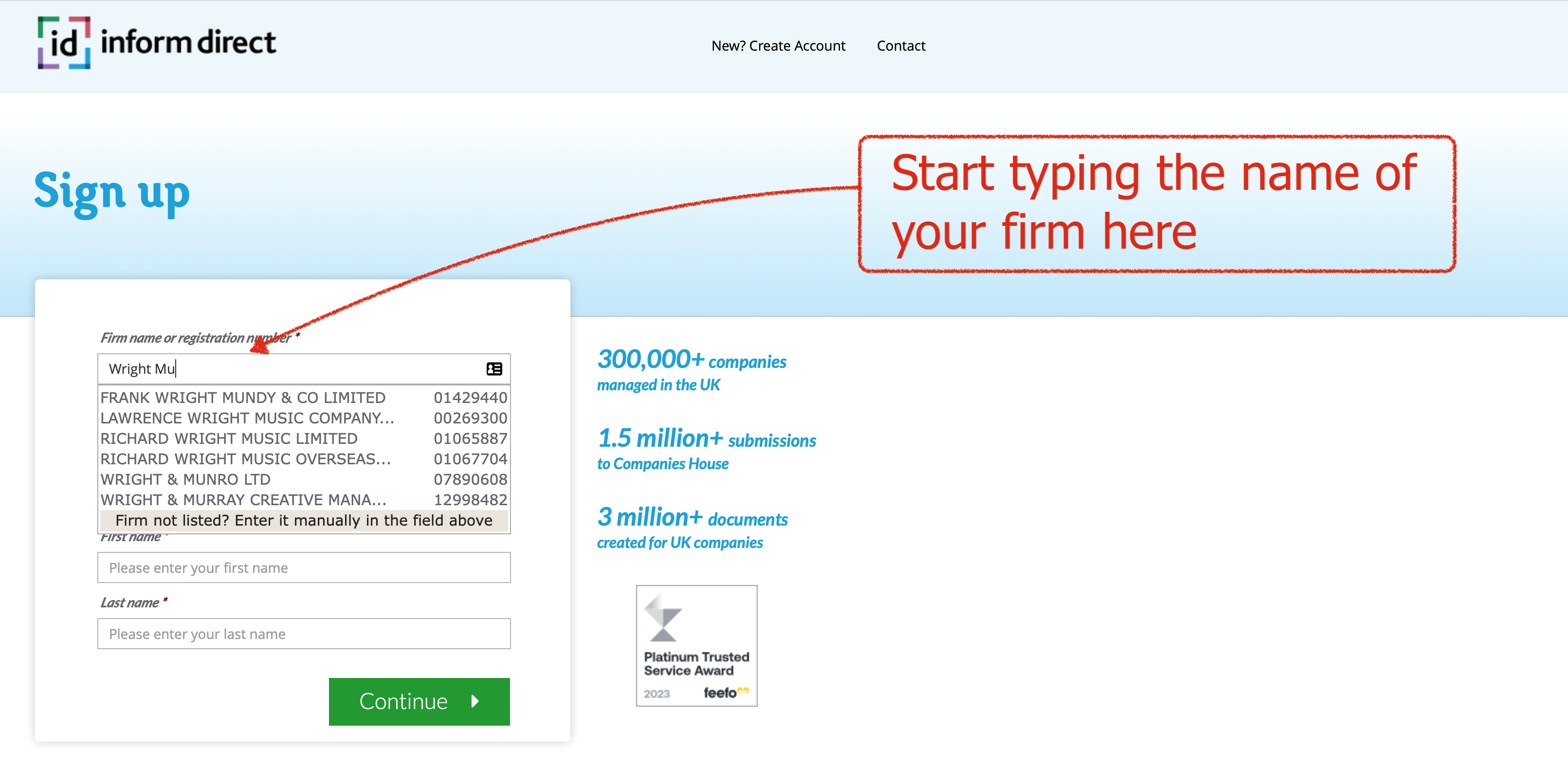 3.4 Now enter the remaining fields shown on screen, including 2 which is drop-down options to describe your firm and 3 the approximate number of UK corporate clients you look after. Adding these details will help us to ensure that you are getting the best from Inform Direct.
