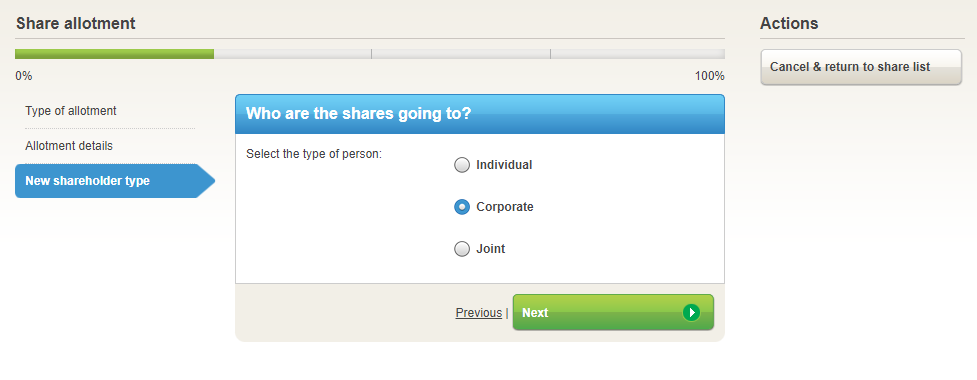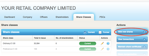 1. Go to the Share Classes tab and select the blue 'Allot new shares' button.