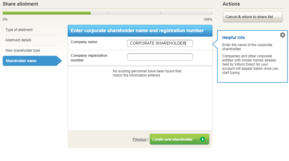 Note: After you have entered 4 characters Inform Direct will look for any possible matches. If the corporate you want appears, you can 'Select' from the suggestion(s) provided. If not, you will need to enter a company name, registration number and click the green 'Create new shareholder' button. If the company does not have a registration number, it is permissible to enter '00000000'.
