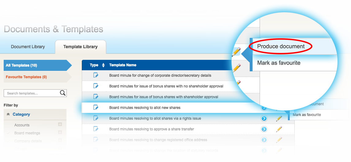 Note: Prepopulated (I.e. company information) documents are generated as part of the relevant Inform Direct wizard. Use the template library if you need to generate a document outside of the relevant process for whatever reason.