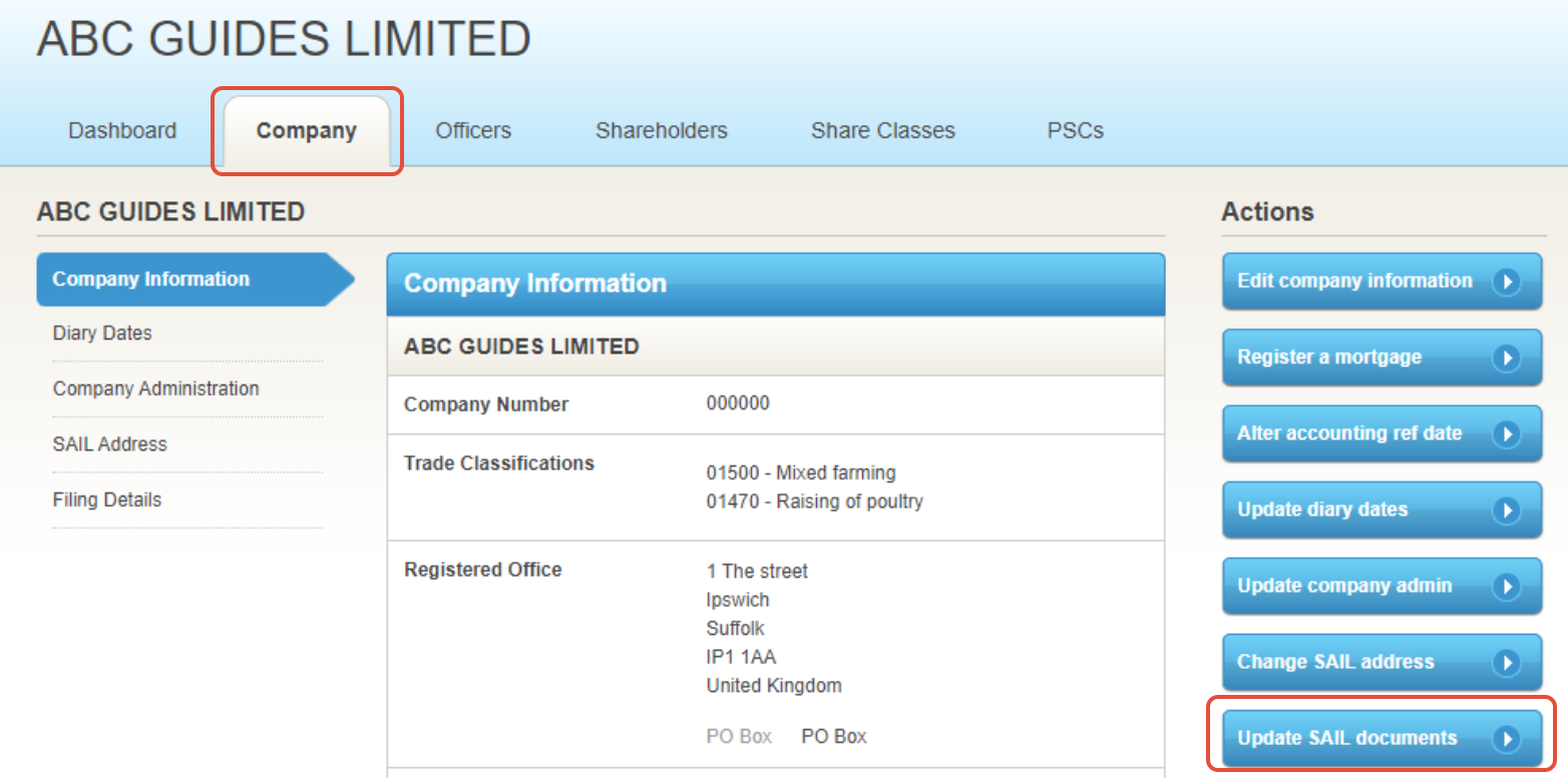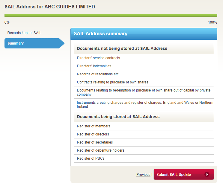 Clicking on the red 'Submit SAIL Update' will send the information to Companies House electronically. on form(s) AD03 or AD04, depending on the changes made.