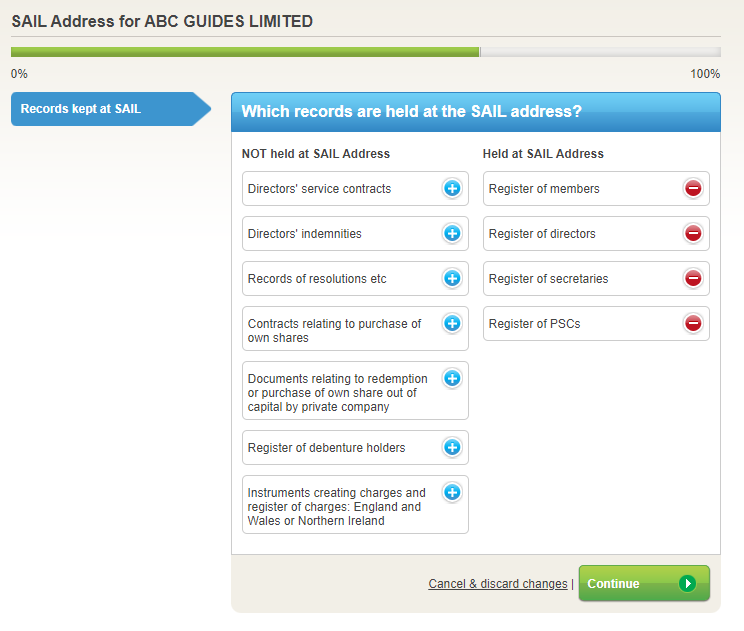 You can make amendments to this by clicking the blue plus sign to notify Companies House that that record is now held at the SAIL address, or alternatively clicking the red minus sign to notify Companies House that that record is no longer held at the SAIL address, but at the Registered Office instead.
