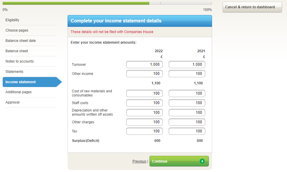 This guide will help you to correctly input the company’s income statement details. Using these details Inform Direct will automatically compile a compliant micro-entity income statement page. The income statement summarises the company’s trading over the accounting period. It shows the company’s income from sales plus any other income and how this compares to the expenses incurred to reach the company’s profit/surplus or loss/deficit over that accounting period.