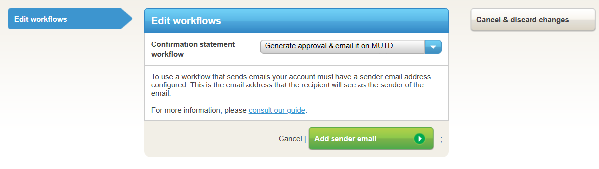 The Edit workflows area will show a Confirmation statement Workflow drop-down box.
