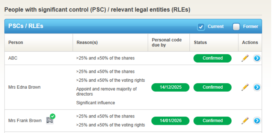 Colour coding here and in the PSC grid depends on if the Companies House personal codes has been entered yet:
