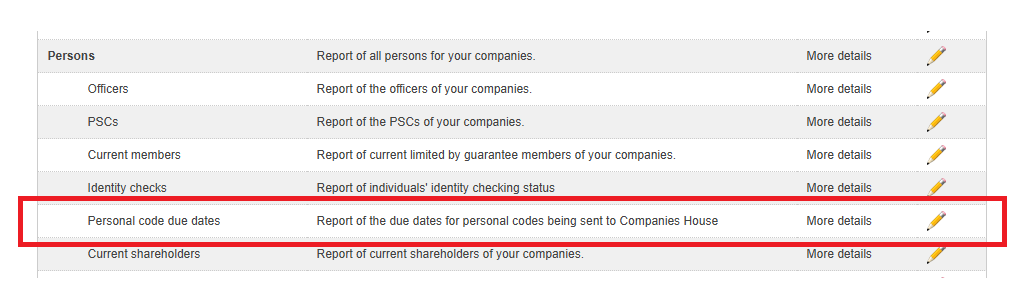 3. The reports tool on the software contains a report of Personal code due dates for PCSs.Office & LLP member due dates can be identified from a confirmation statement due dates report.