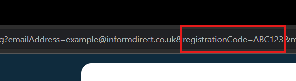 Within the URL they will see the text registrationCode= and it will be a 6 digit code consisting of numbers and letters.